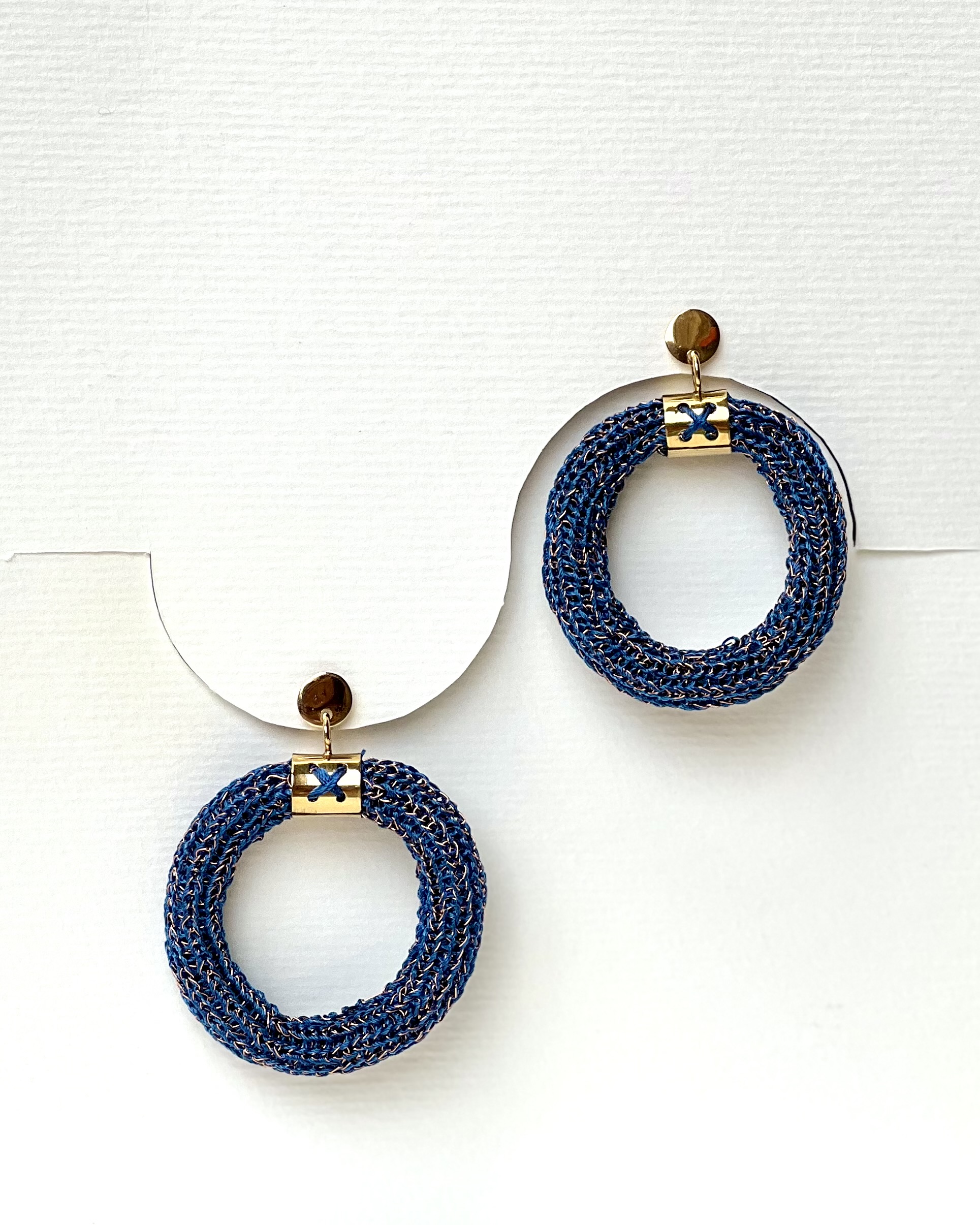 Légèreté et douceur pour ces boucles d’oreilles généreuses en maille de cuivre émaillé et fil de couleur Bleu Royal, entièrement faites main.