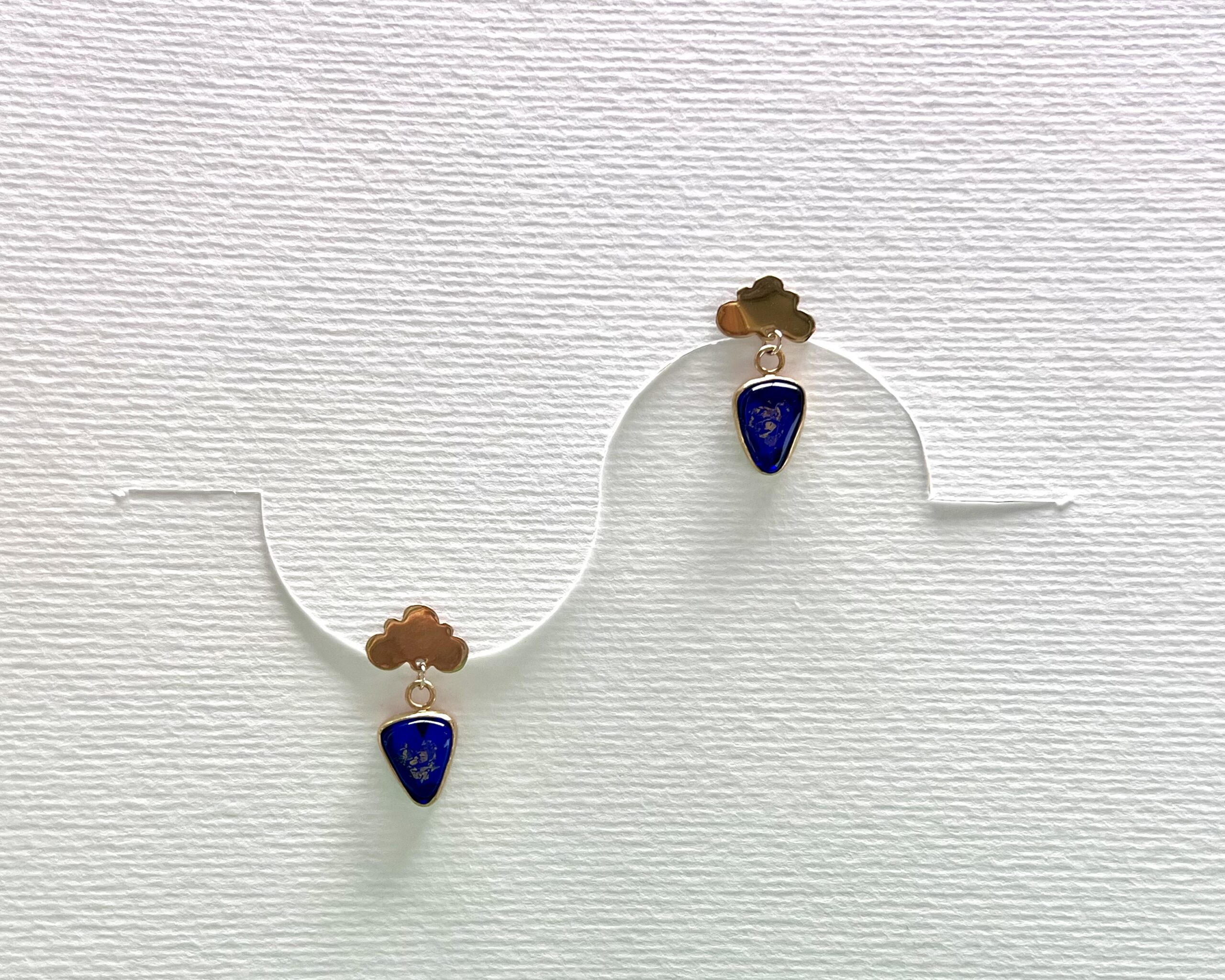 Je vous propose de délicates boucles d’oreilles en laiton doré à l’or fin, ornées d’une petite goutte de verre bleu empire, lumineuse et poétique.