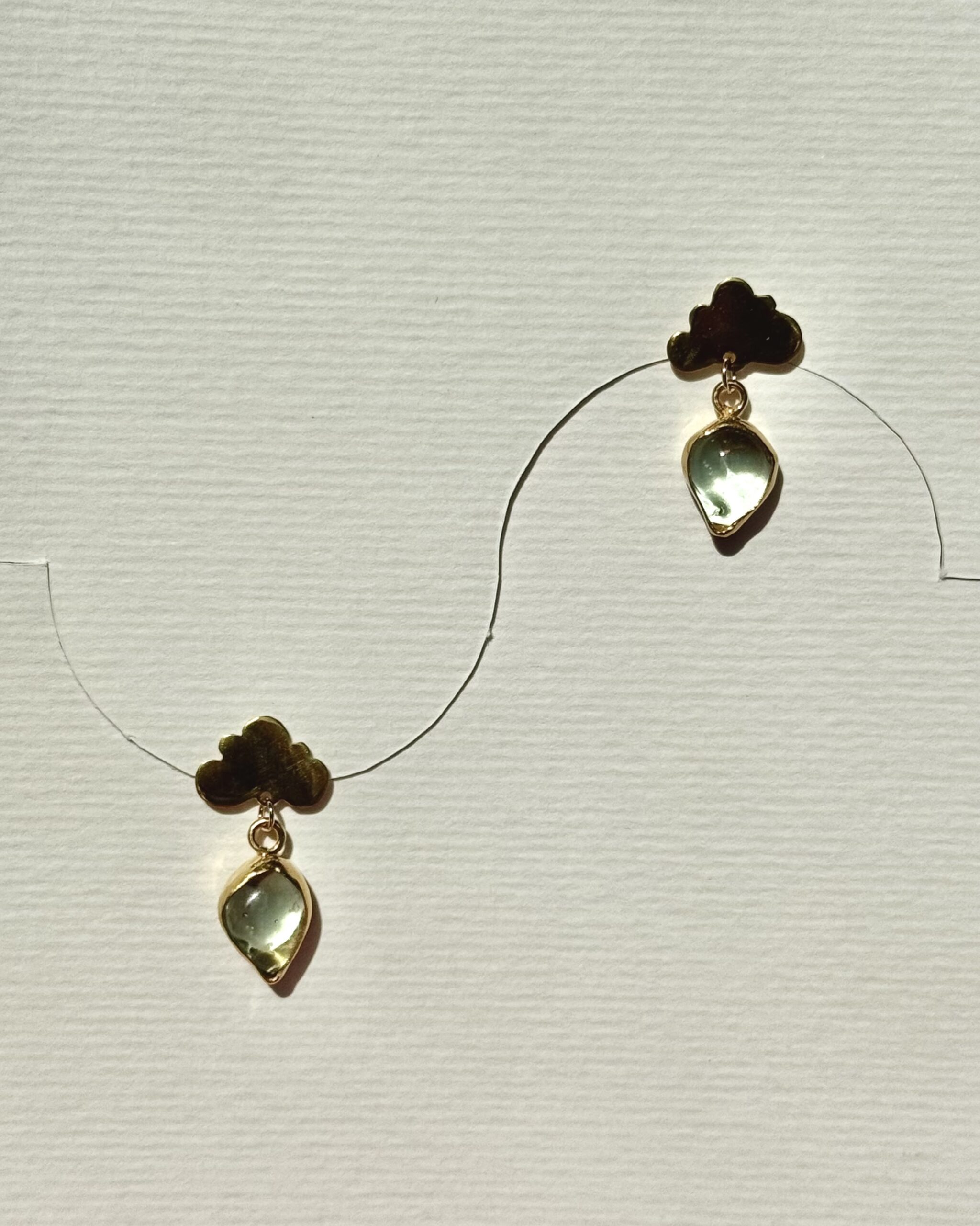 Pour créer ces gouttes, je récupère des bouteilles en verre que je lave, casse soigneusement puis dépose en éclats dans de petits moules en forme de gouttes. Les moules passent ensuite au four pour un fusing: sous l’effet de la chaleur, les morceaux de verre fondent et se transforment en une petite goutte lisse et brillante, prête à être sertie à la main dans son support en laiton doré.