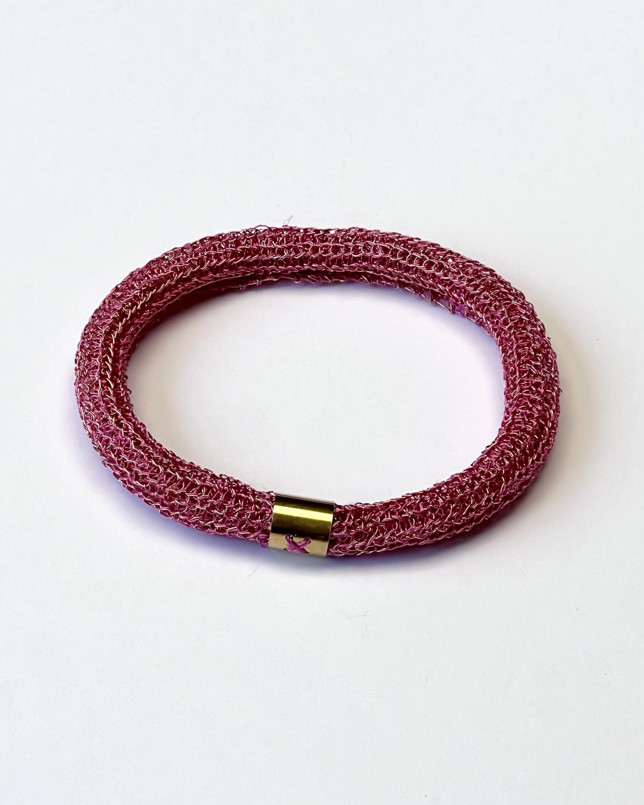 Élégance et légèreté pour ce bracelet en maille de cuivre émaillé et fil de couleur Fuchsia, entièrement fait main.