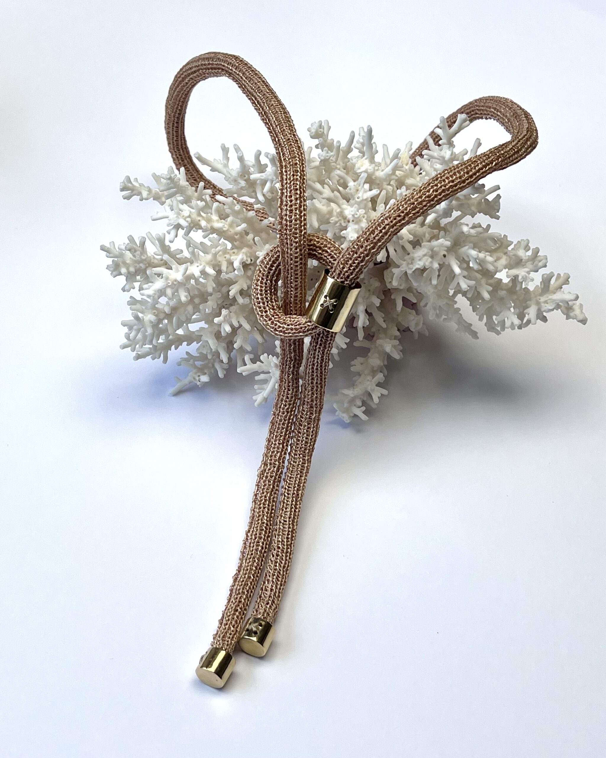 Une bande souple, soigneusement travaillée en maille tricot est ensuite délicatement roulée pour former un bijou original, à la fois aérien et tout doux au touché.
