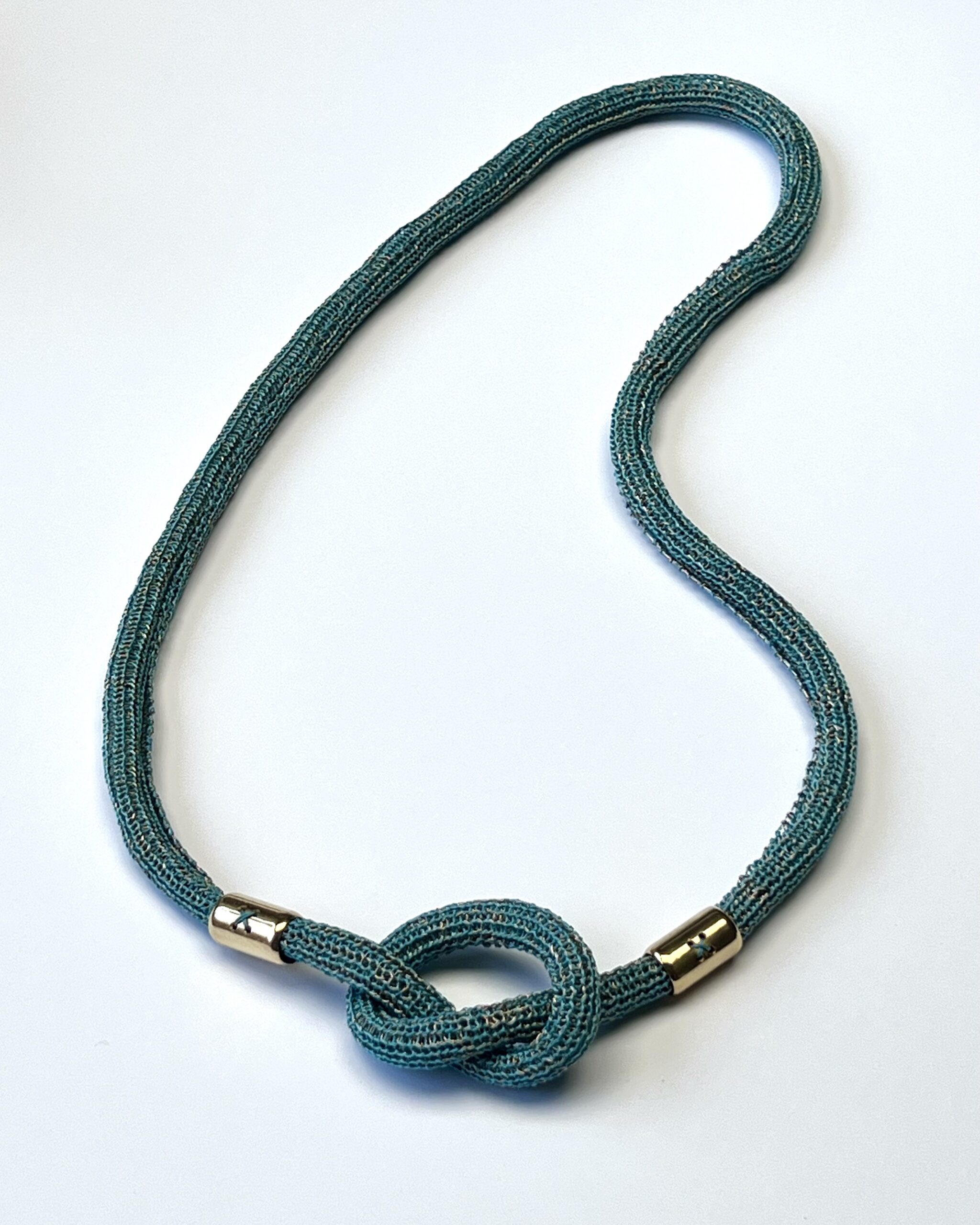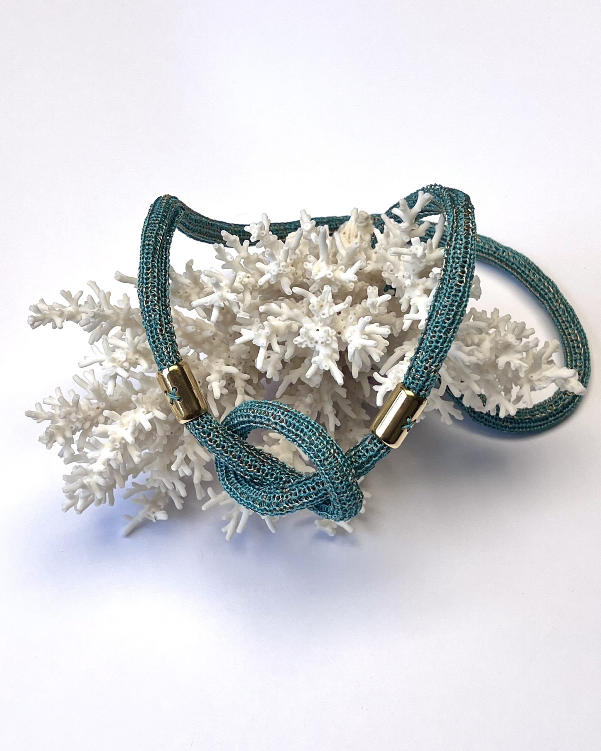 Une bande souple, soigneusement travaillée en maille tricot est ensuite délicatement roulée pour former un bijou original, à la fois aérien et tout doux au touché.