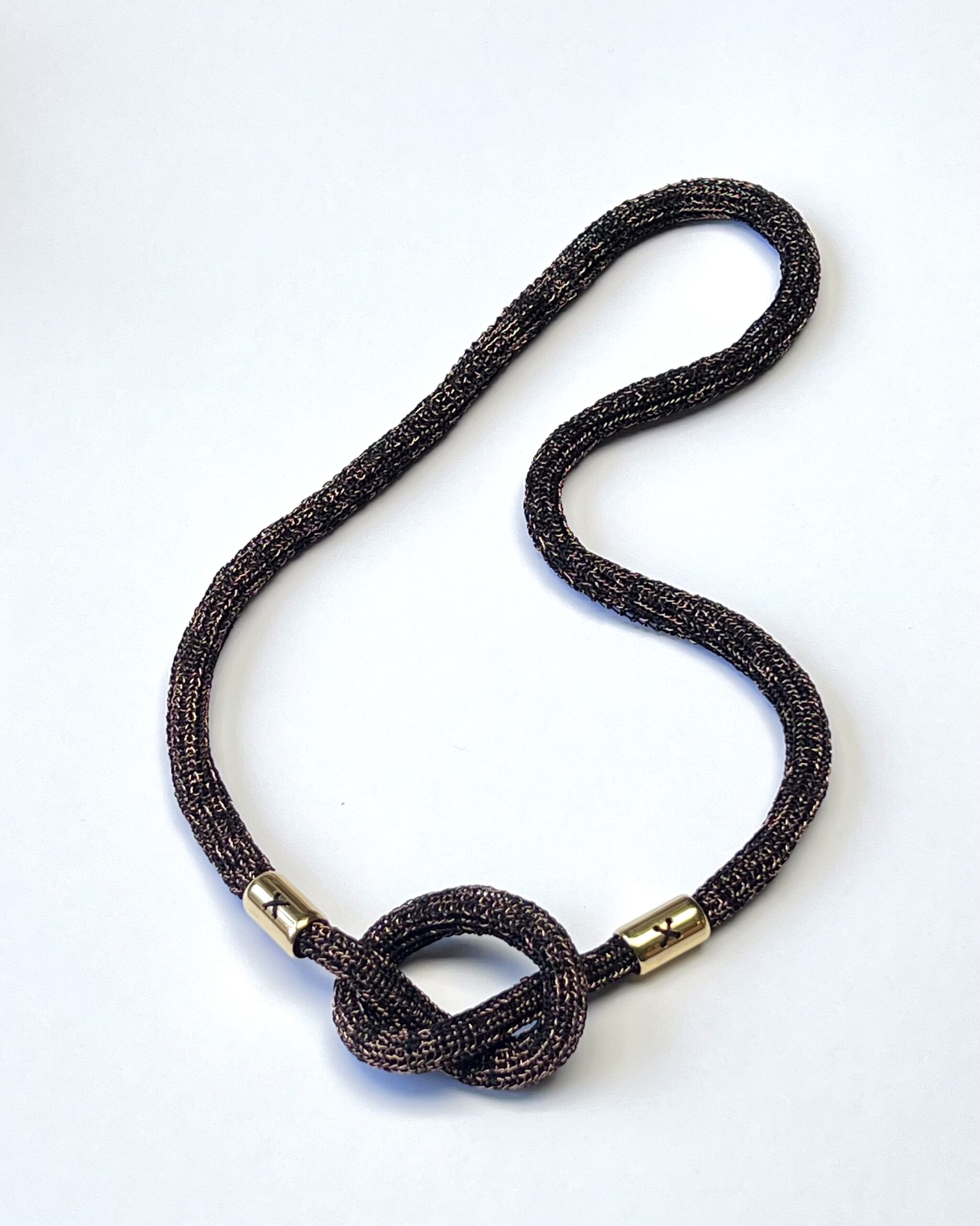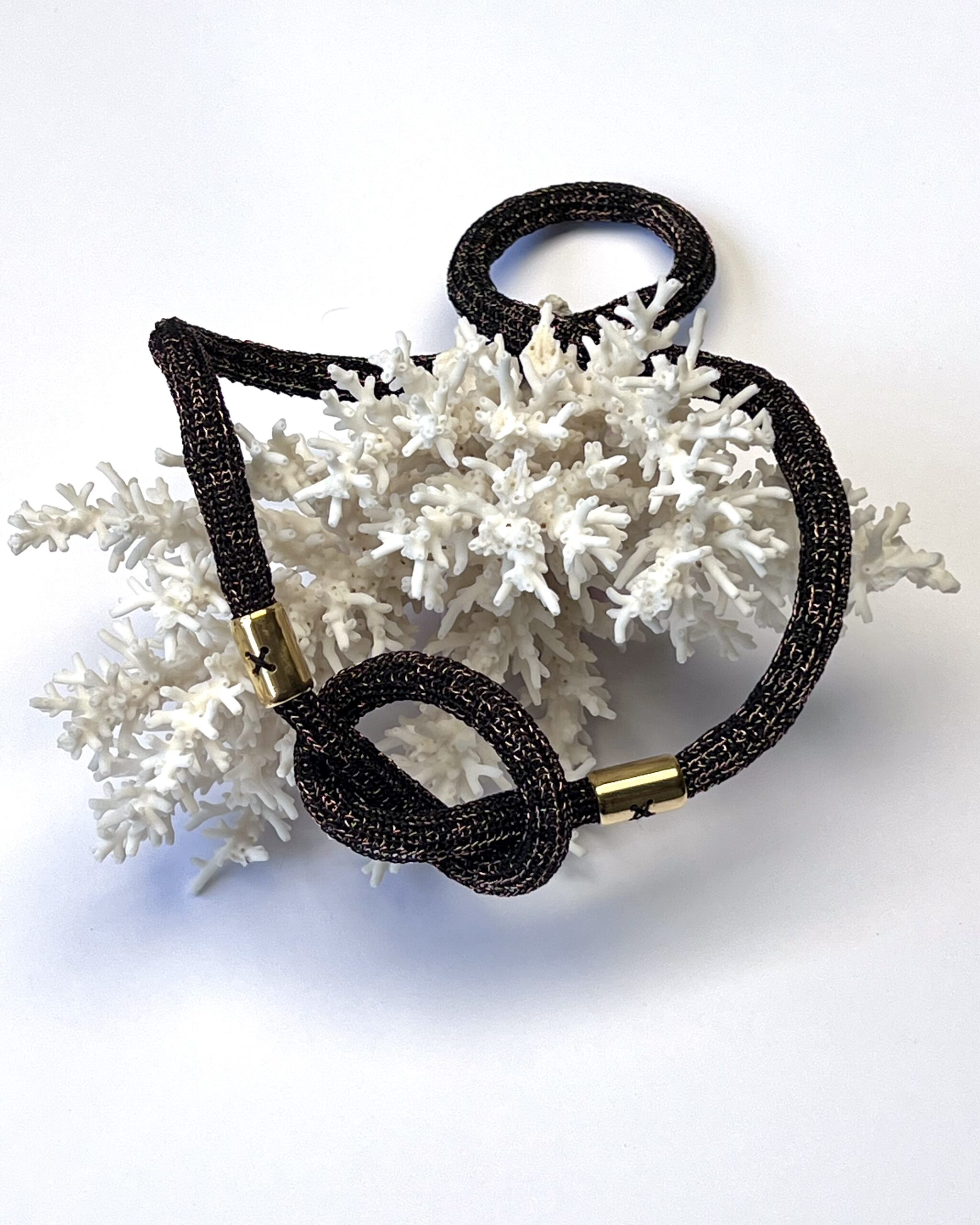 Une bande souple, soigneusement travaillée en maille tricot est ensuite délicatement roulée pour former un bijou original, à la fois aérien et tout doux au touché.